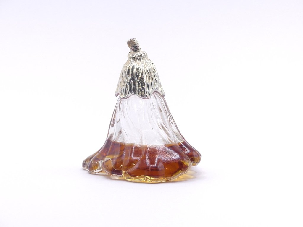 Flacon verre transparent en forme de fleur. Bouchon argent.