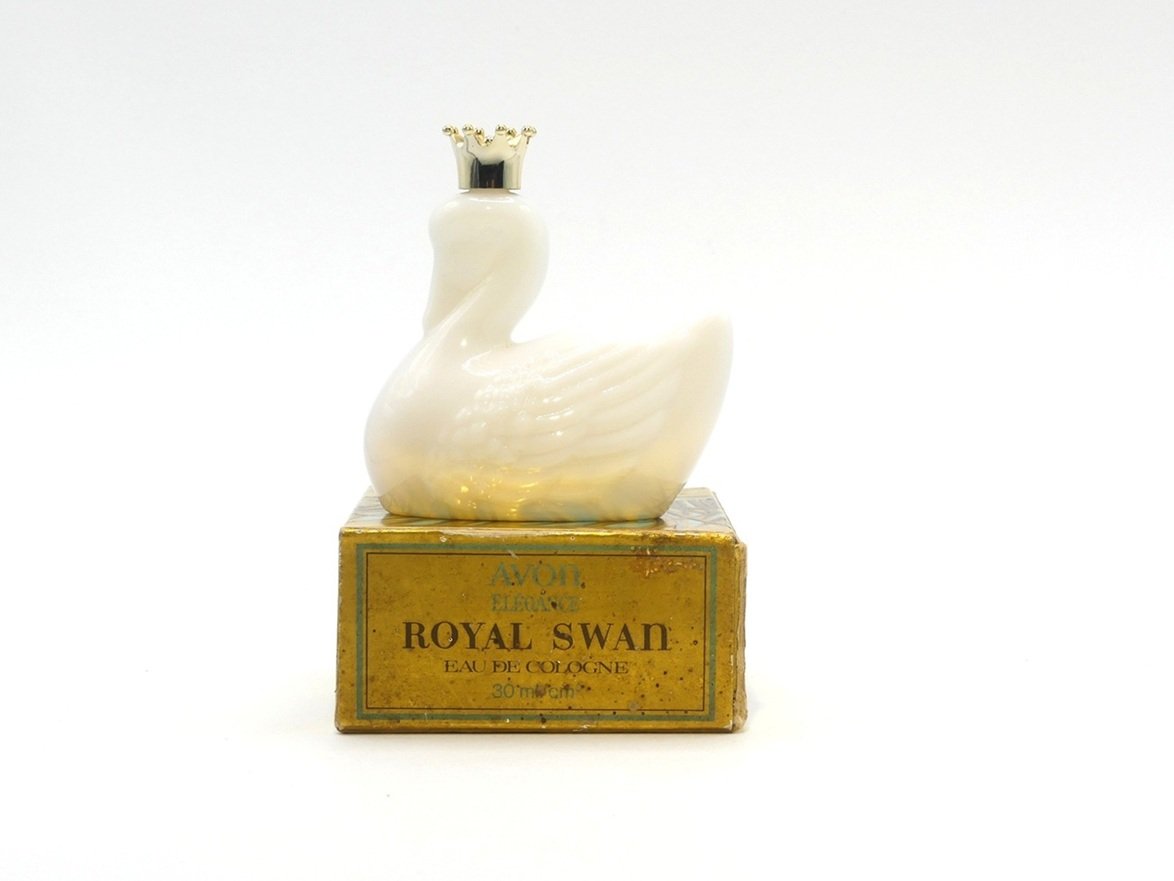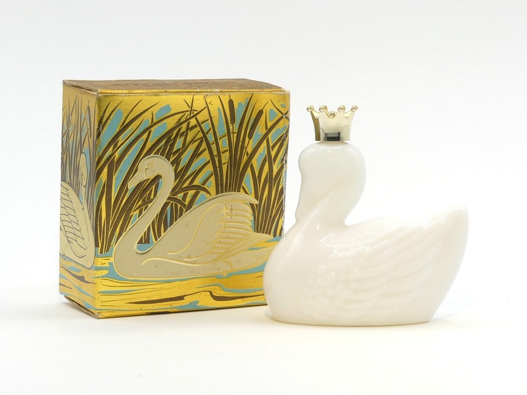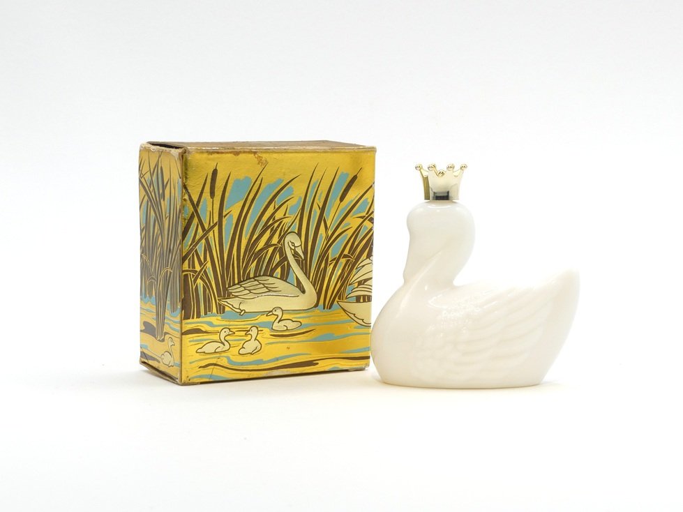 Flacon verre bakélite blanc en forme de cygne. Bouchon plastique à vis doré en forme de couronne.
