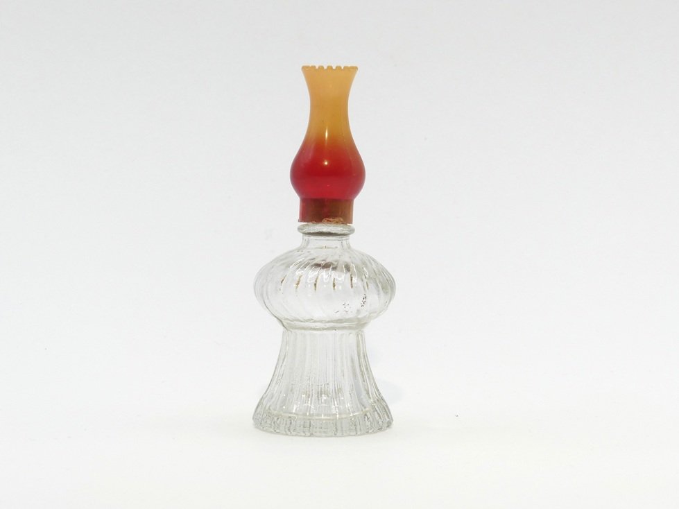 Flacon verre transparent en forme de lampe lampe à pétrole ancienne. Bouchon figurant le haut de la lampe à pétrole en plastique rouge dégradé orange.