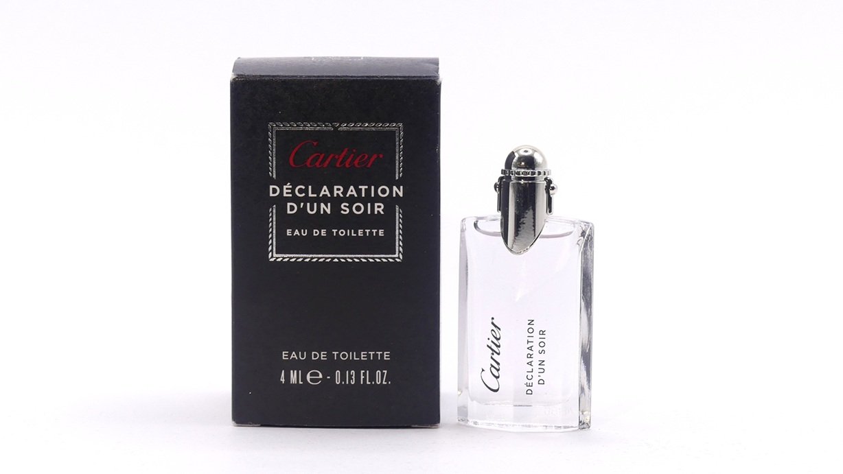 Flacon verre transp decoupe rectangulaire cotés arrondis. Sérigraphie noire. Bouchon plstique clip cylindrique argent ouvragé. Boite noire, sérigraphie rouge, blanc argent.