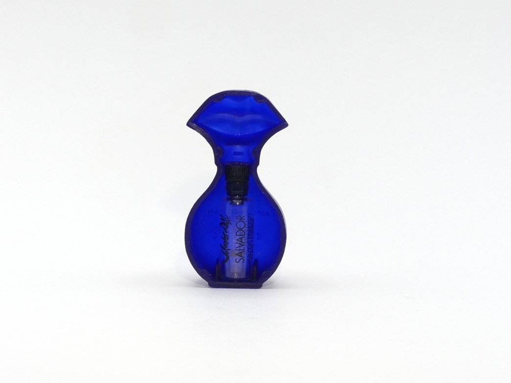 Flacon tubulaire transparent cylindrique enchassé coque plastique trompe-oeil lèvres & ventre bleu.