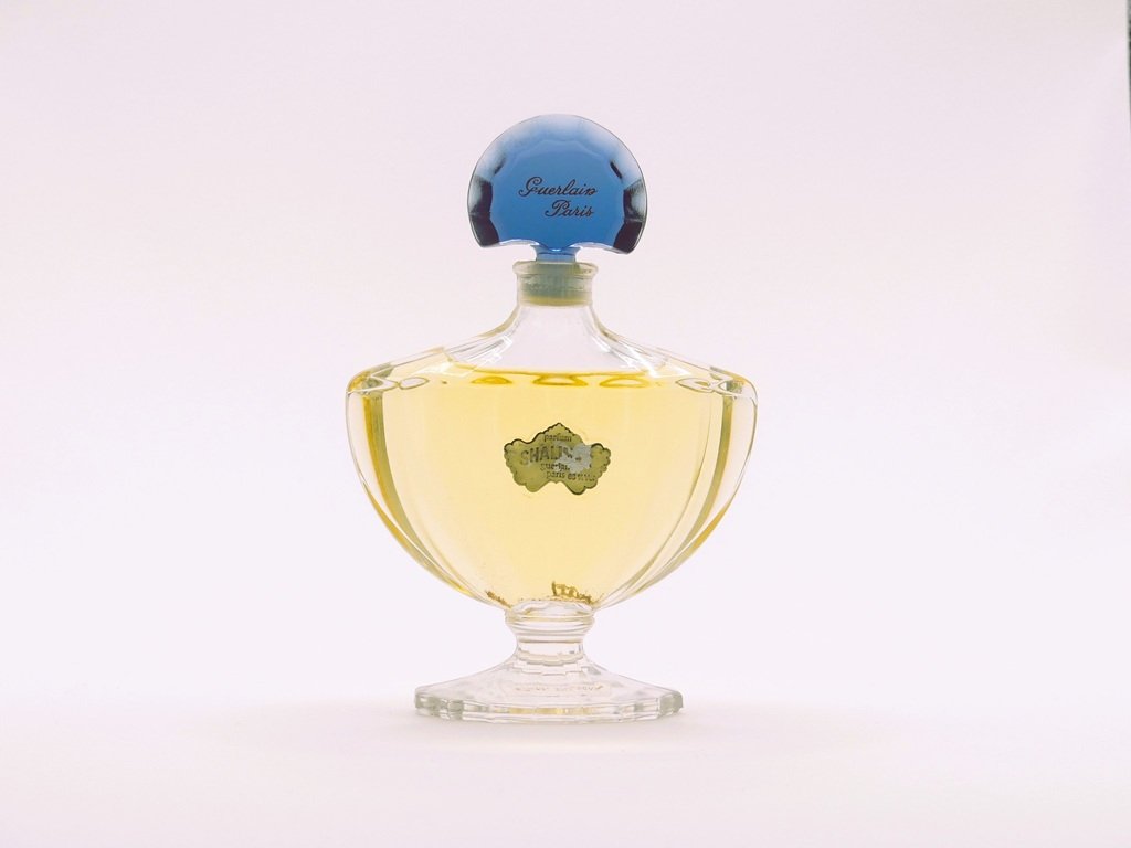 Flacon verre transparent forme vasque strié verticale – étiquette papier dorée, serig bleue marine en partie effacée