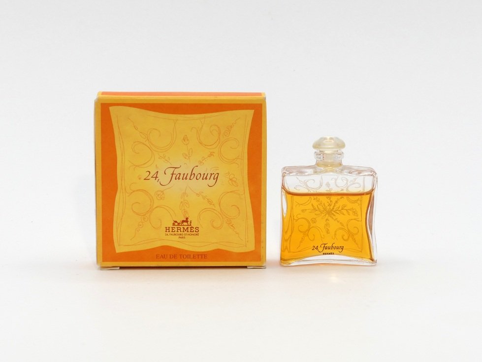 Boite orange foncé avec dessin d’un foulard sur orange clair. Sérigraphie rouge.