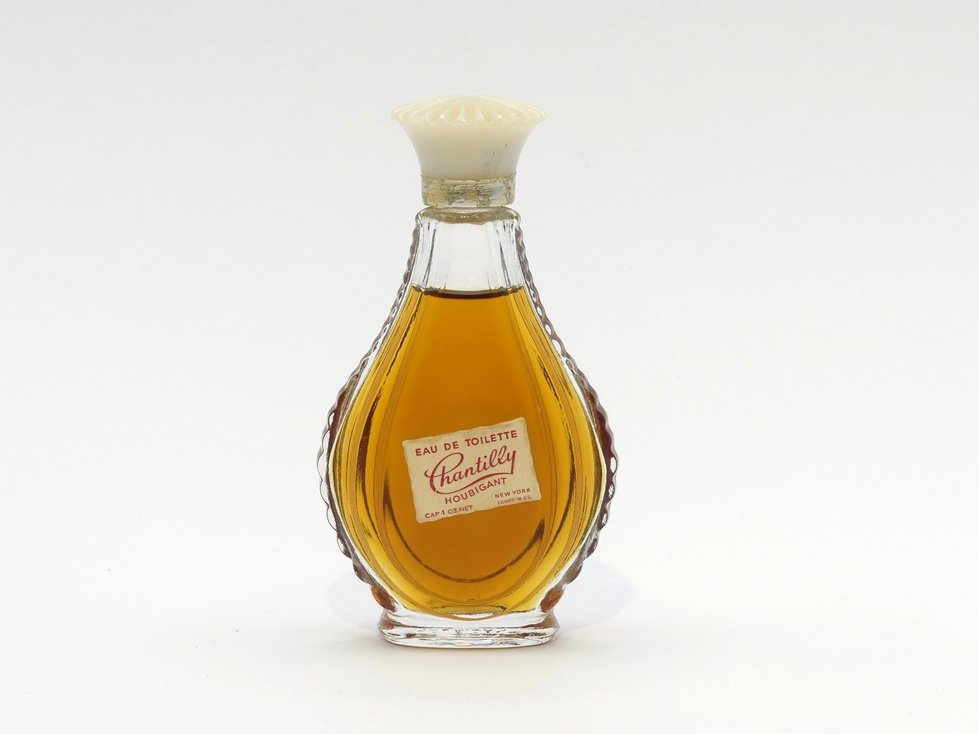 Flacon verre transparent découpe piriforme cotés ciselés assise elliptique – étiquette papier rectangulaire blanche, texte rouge.