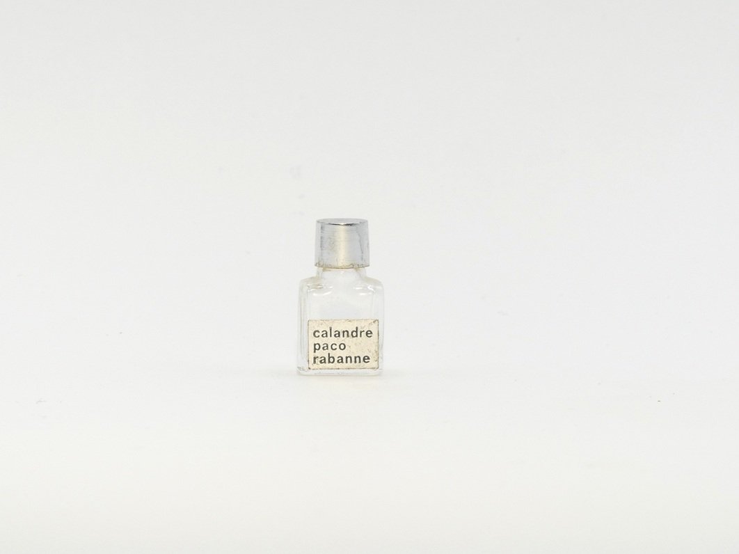 Flacon verre transparent découpe carrée section rectangulaire – étiquette papier rectangulaire argent.