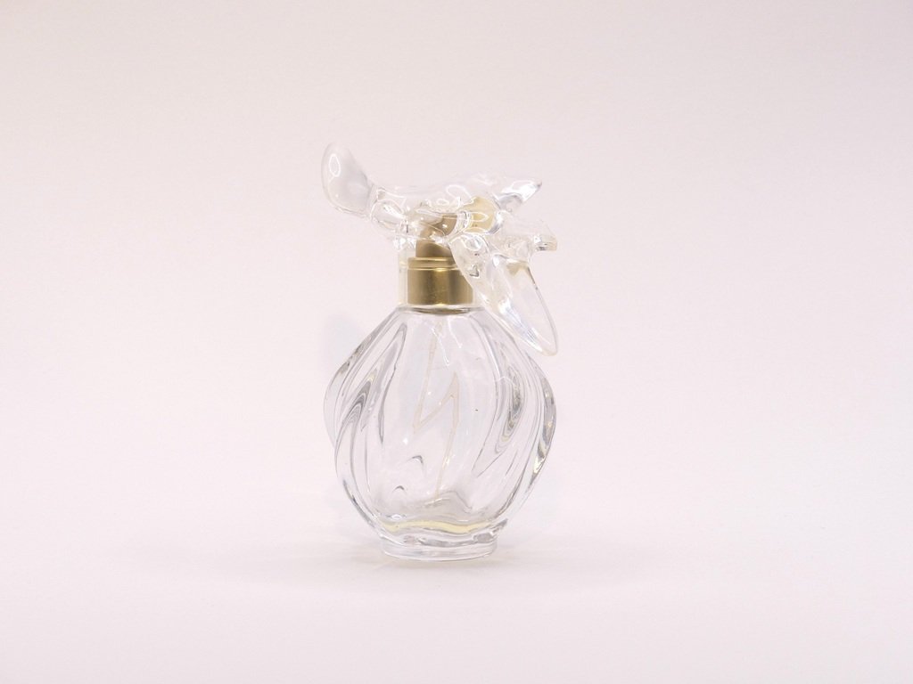 Flacon vaporisateur verre transparent pansu torsadé collerette dorée autour du col – non sérigraphie