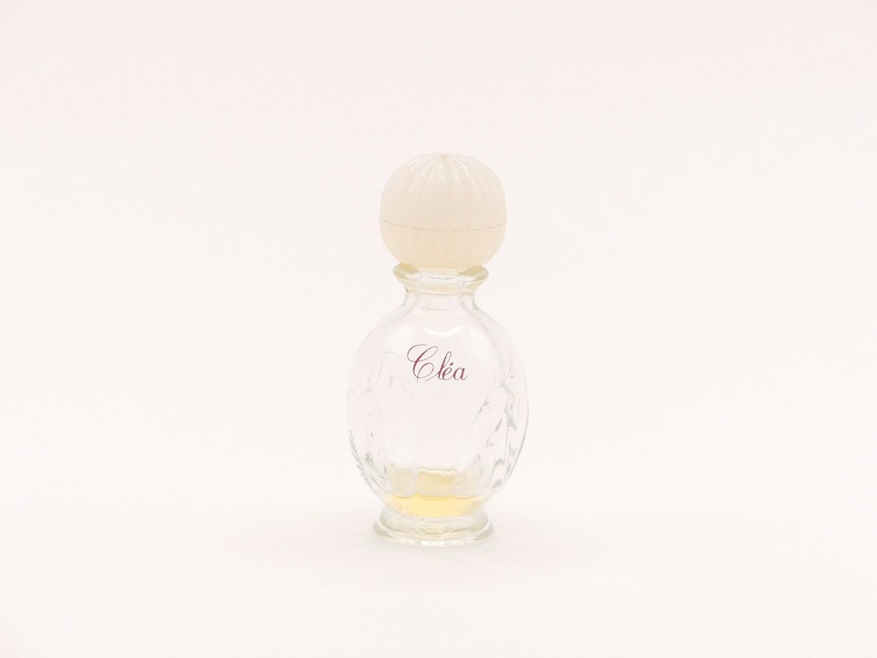 Flacon verre transparent découpe ovoidale ouvragé assise cylindrique – sérigraphie dorée 1 lignes horizontales.