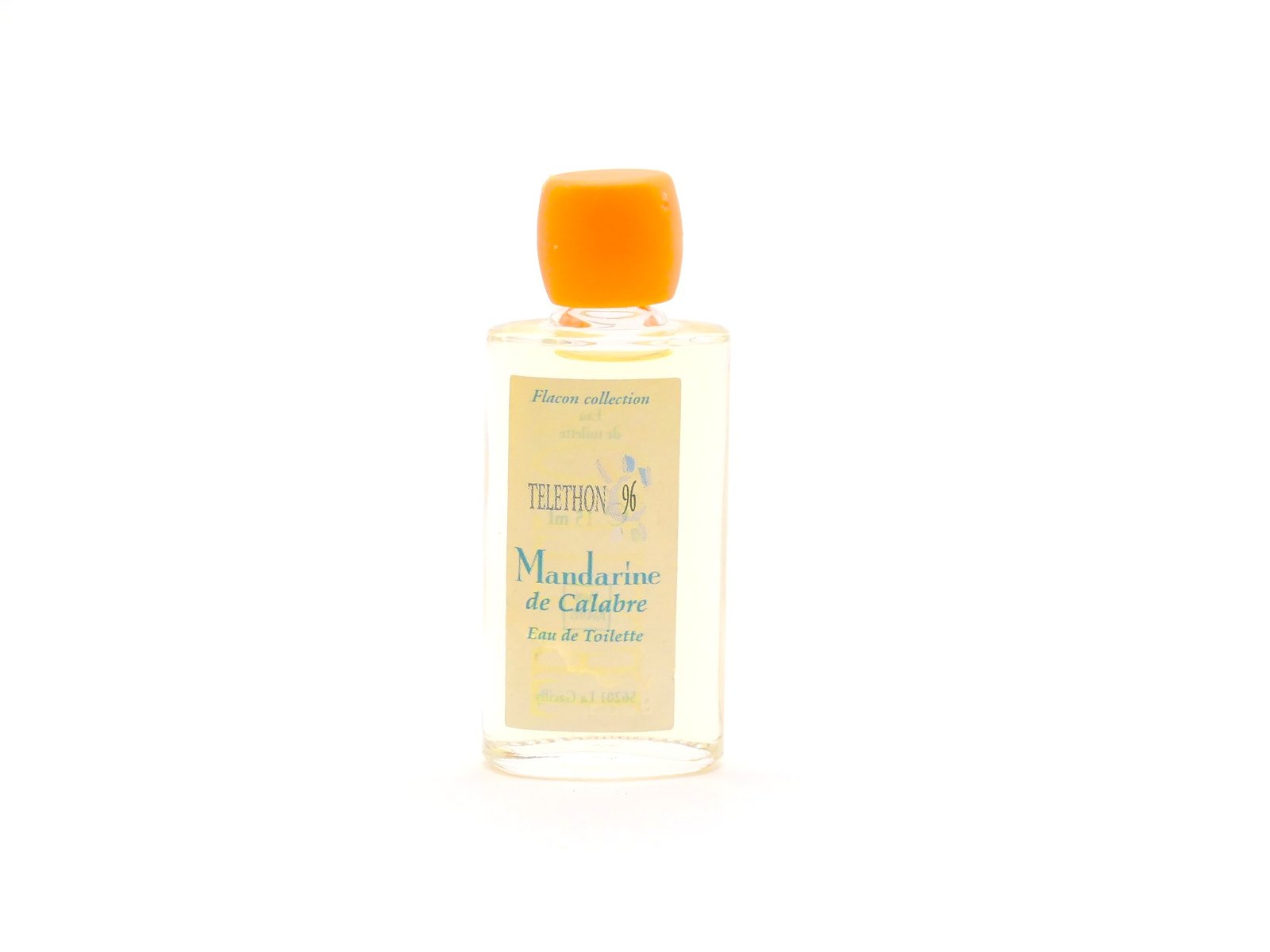 Flacon verre transparent decoupe eliptique étiré . Etiquette papier rectangulaireorange . Bouchon à vis tonnelet orange.