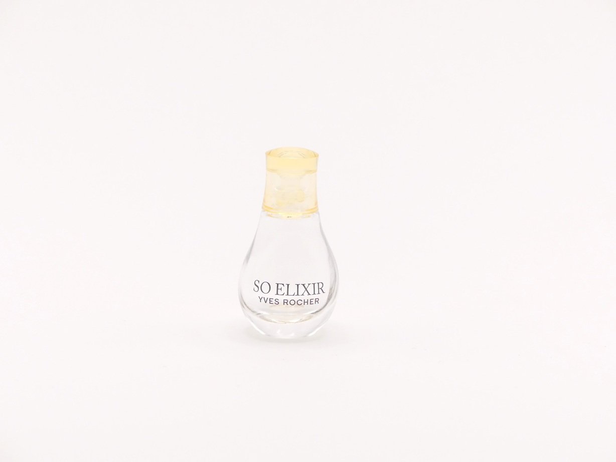 Flacon verre transparent forme goutte – sérigraphie marron.